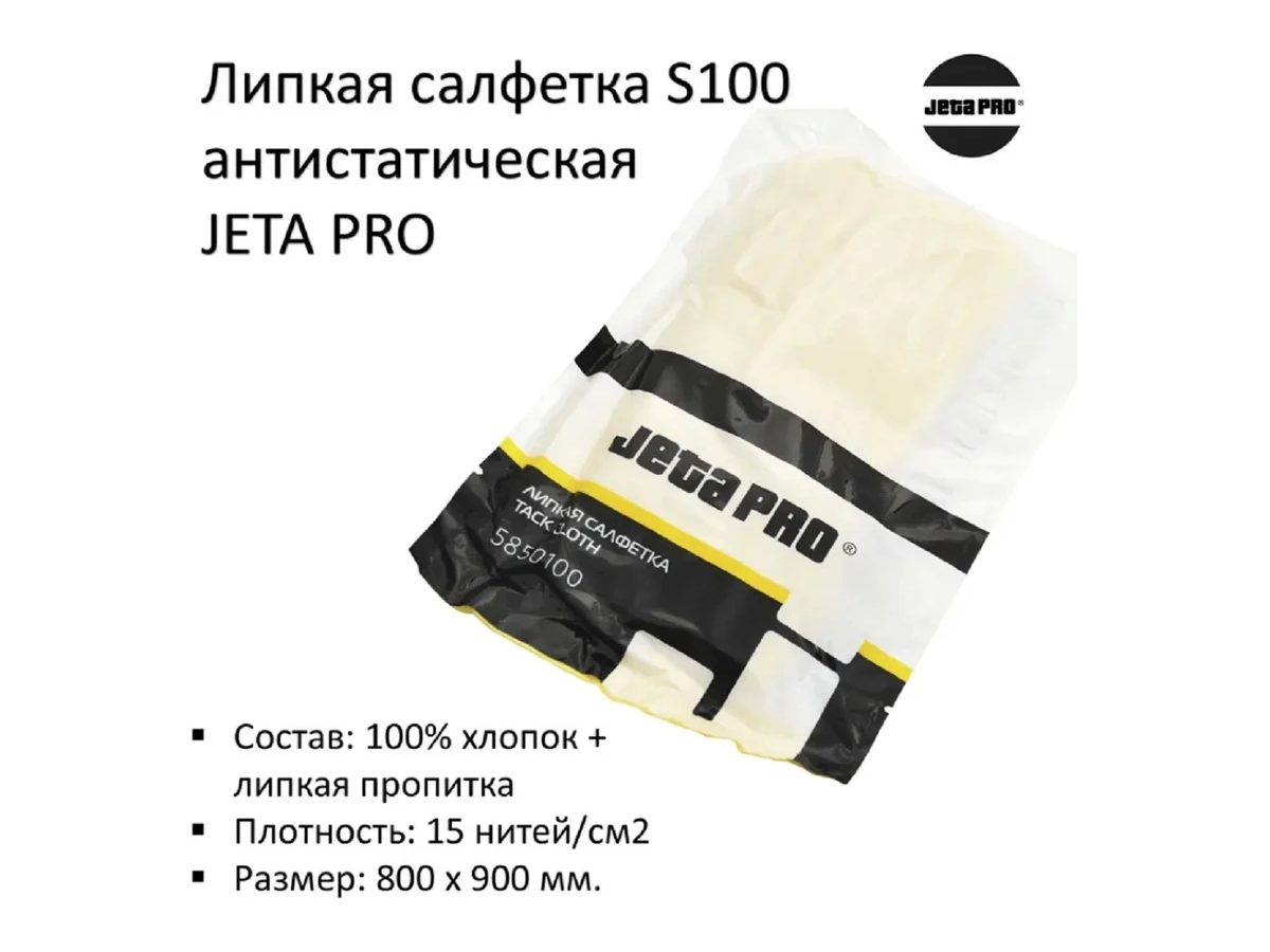 Липкая антистатическая салфетка Jeta PRO 5850100 изготовлена из неотбеленной стёганной марли, имеют липкую пропитку. Применяется для удаления ворсинок и тяжелой пыли перед окрашиванием различных поверхностей.