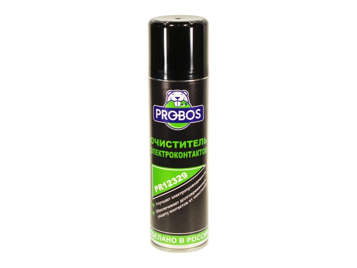 Очиститель электроконтактов PROBOS 335 мл, аэрозоль PR12329 качественно очищает электрические контакты от окислов, препятствующих прохождению тока. Очищает клеммы, штекерные соединения, цоколи ламп, кабельные переключатели, печатные платы, реле, распределители зажигания, прерыватели, стартеры, генераторы, антенны, электрические разъемы и т. д.