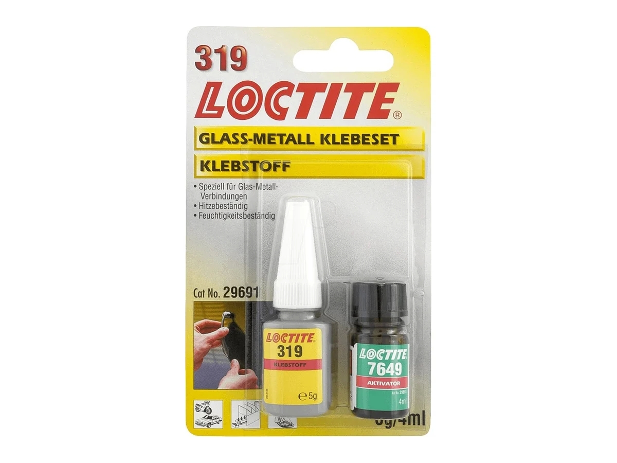 Набор для приклеивания зеркала заднего вида LOCTITE AA 319/7649 5 г + 4 мл 249998 позволяет быстро произвести склеивание деталей из металла, стекла, керамики или пластмассы. Оптимально подходит для применения в небольших зазорах до 0.1 мм. Обладает стойкостью к ударам и вибрациям. Клей хорошо удерживается на поверхности при нанесении.