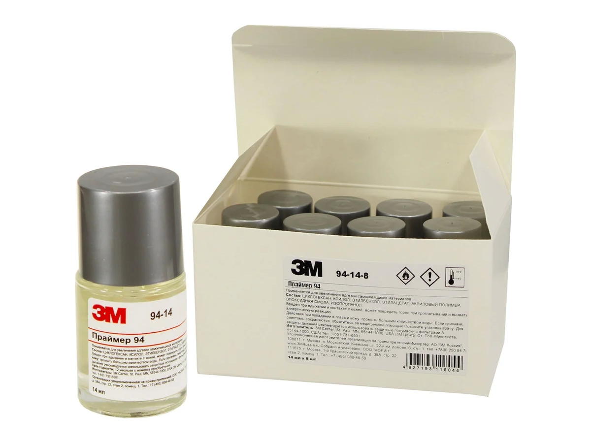 Праймер 3М 94 14 мл упаковка 8 шт 4627193118044 рекомендуется для повышения клейкости (адгезии) клейких лент к таким поверхностям, как полипропилен, полиэтилен, ABS, бетон, сочетание PET\PBT, дерево, металл, стекло и окрашенные металлические поверхности.