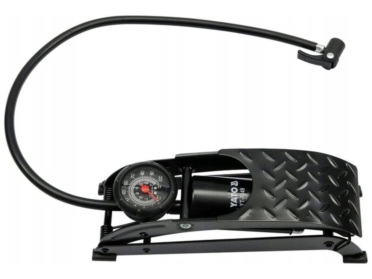 Однопоршневой ножной насос прочной конструкции, изготовленный из тисненого лакированного стального листа толщиной 3 мм. Манометр с показаниями до 7 бар.
