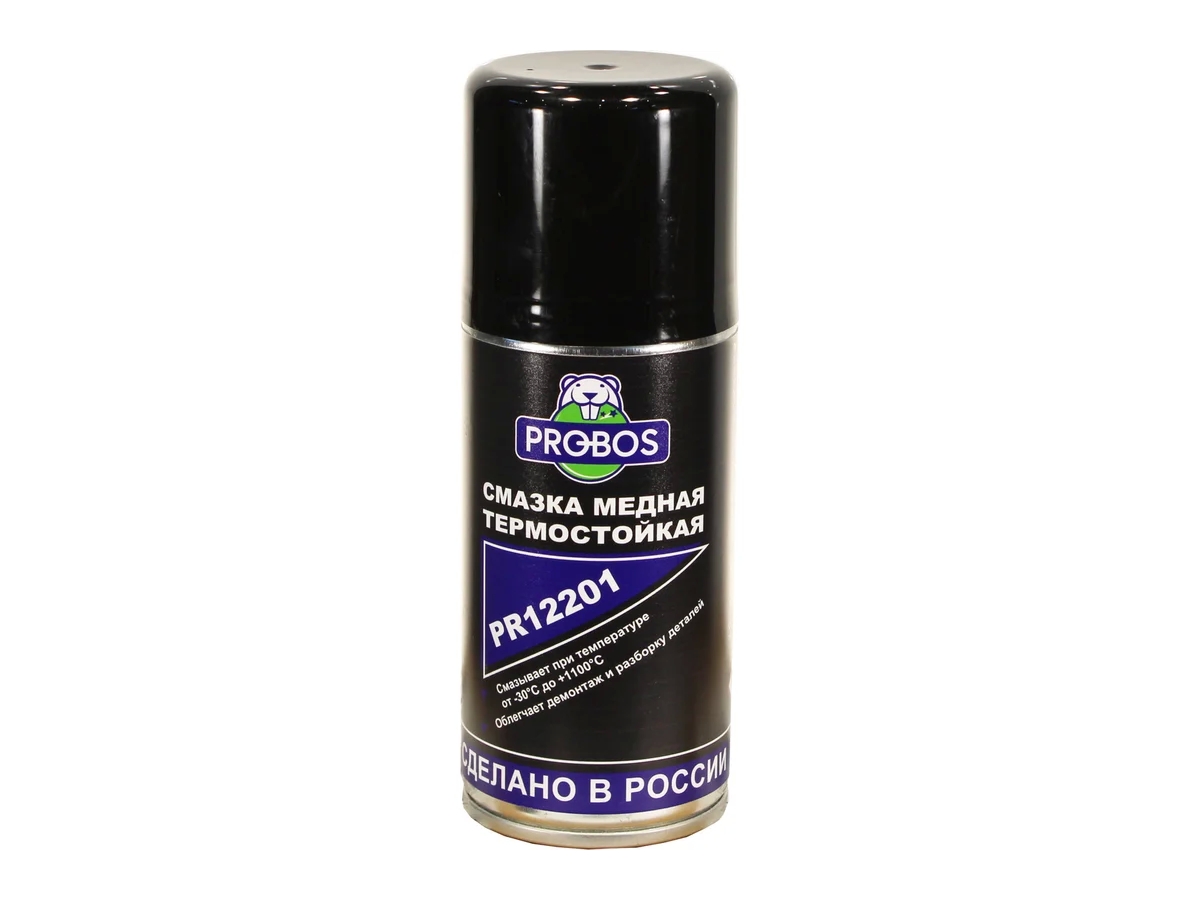 Медная термостойкая смазка PROBOS 210 мл, аэрозоль PR12201 предназначена для обработки резьбы свечей зажигания, направляющих тормозных колодок, болтов, соединений газовыхлопного тракта и других деталей, работающих при повышенных температурах. Температурный диапазон применения от минус 30°С до плюс 1100°С. Медная смазка для термически нагруженных узлов и деталей автомобилей. Предотвращает коррозию и заедание перечисленных деталей, а также "прикипание" шпилек выпускного коллектора, колесных болтов и т. п. Облегчает разборку механизма после длительной эксплуатации. Обладает высокой стойкостью к атмосферным осадкам, щелочной среде и растворам дорожных реагентов.