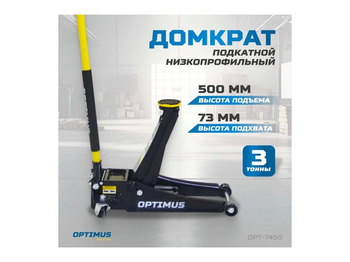 Домкрат подкатной OPT-7450 предлагает надежное и удобное решение для подъёма транспортных средств весом до 3 тонн. Высота подхвата составляет всего 73 мм, что позволяет производить работы с автомобилями с низким дорожным просветом. Высота подъема - 500 мм.