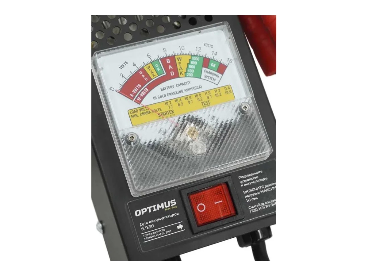 Устройство оснащено усиленными зажимами с паянными контактами, надежно фиксирующимися на клеммах тестируемого АКБ.