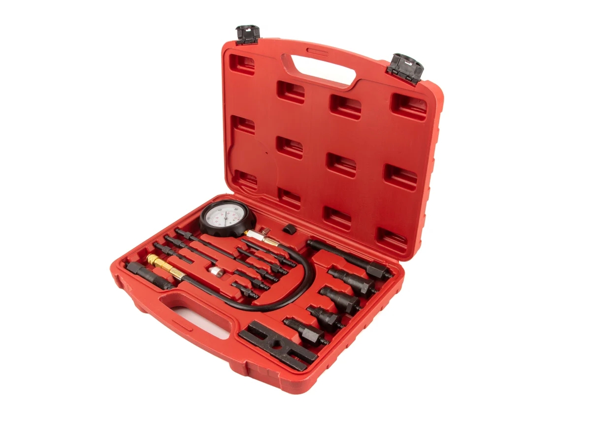 Дизельный компрессометр WDK-214290 в прорезиненном корпусе предназначен для точного измерения давления в цилиндре. Манометр фиксирует максимальное значение — стрелка «зависает» на пиковом показателе, что позволяет работать без помощника. Эргономичный прорезиненный корпус удобно лежит в руке и обеспечивает защиту от ударов и падений. После замера давление сбрасывается клапаном. В комплекте — набор из 14 адаптеров (имитаторы форсунок и свечей накаливания) для работы с большинством дизельных двигателей.
