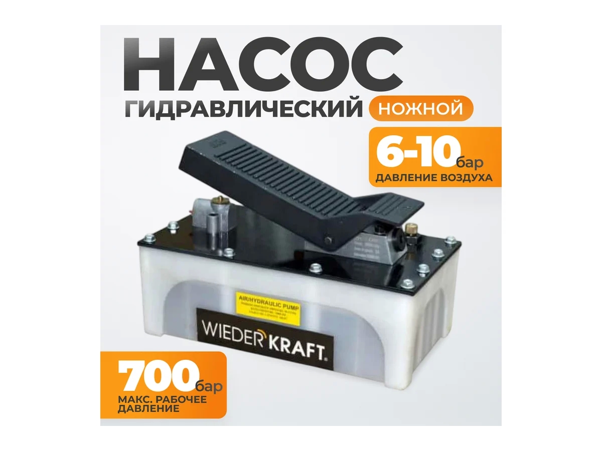 Пневмогидравлический насос WIEDERKRAFT WDK-85100 оснащается ножным управлением, что значительно упрощает работу со сложными системами. Изделие можно подключить к: