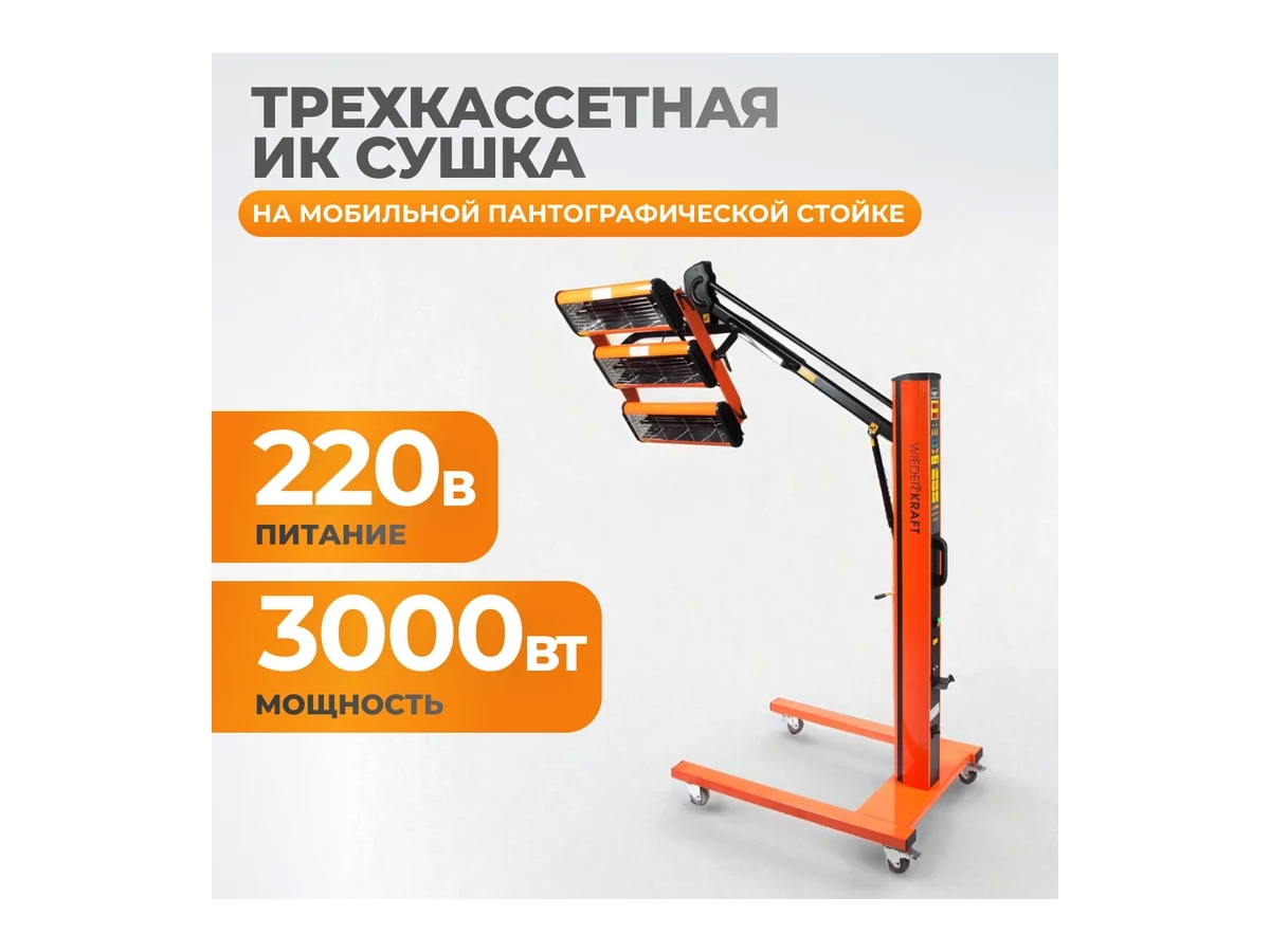 Трехкассетная сушка мобильная ИК WIEDERKRAFT WDK-3AT установлена на пантографической стойке. Изделие используется для ускоренной сушки окрашенных деталей или поверхностей. Применение сушки повышает качество покрасочного слоя. Благодаря газовым амортизаторам можно поднять блок на высоту до 2100 мм, что обеспечивает высококачественную сушку деталей любой формы и размеров. Положение кассет регулируется при помощи крепежных винтов.