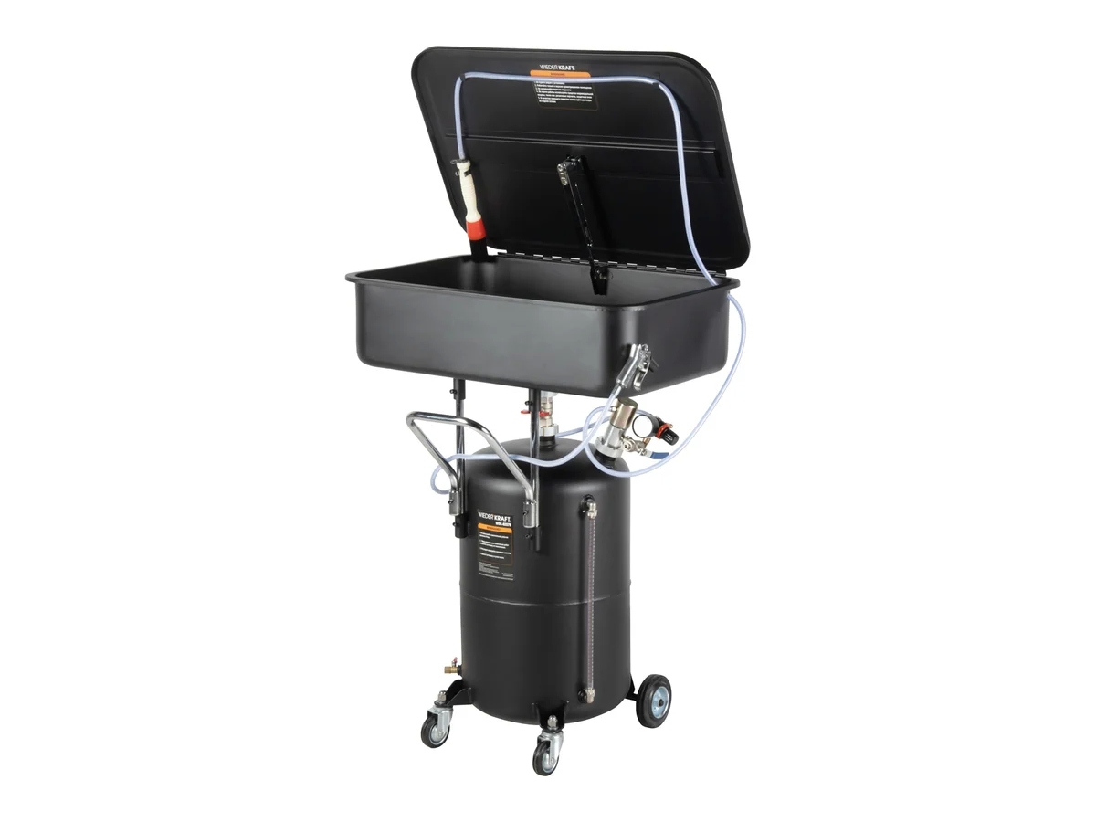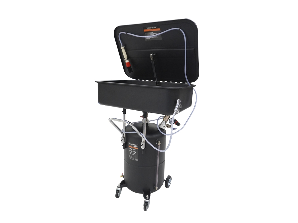 Пневматическая установка WIEDERKRAFT WDK-82079 предназначена для очистки деталей и агрегатов с использованием растворов на водной основе. Оснащена автономным пневматическим блоком, который позволяет использовать установку без постоянного подключения к пневмолинии в течение ограниченного времени. Конструкция с двумя поворотными и двумя фиксированными колесами облегчает транспортировку. В комплекте поставляются обдувочный пистолет, две щетки для очистки, ФУМ-лента и шестигранный ключ. Крышка ванны оборудована упорным механизмом, а на резервуаре расположены индикатор уровня жидкости и манометр для контроля рабочих параметров.