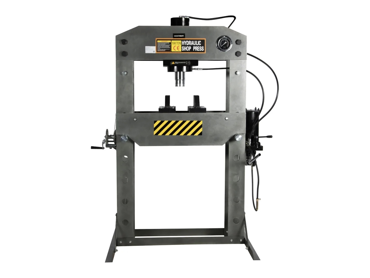 Регулируемый рабочий стол (в диапазоне от 90 до 935 мм) дает возможность обрабатывать детали разных габаритов. Для защиты от перегрузок предусмотрен встроенный предохранительный клапан. Высокоточный жидкостный манометр помогает оператору контролировать прикладываемое усилие.