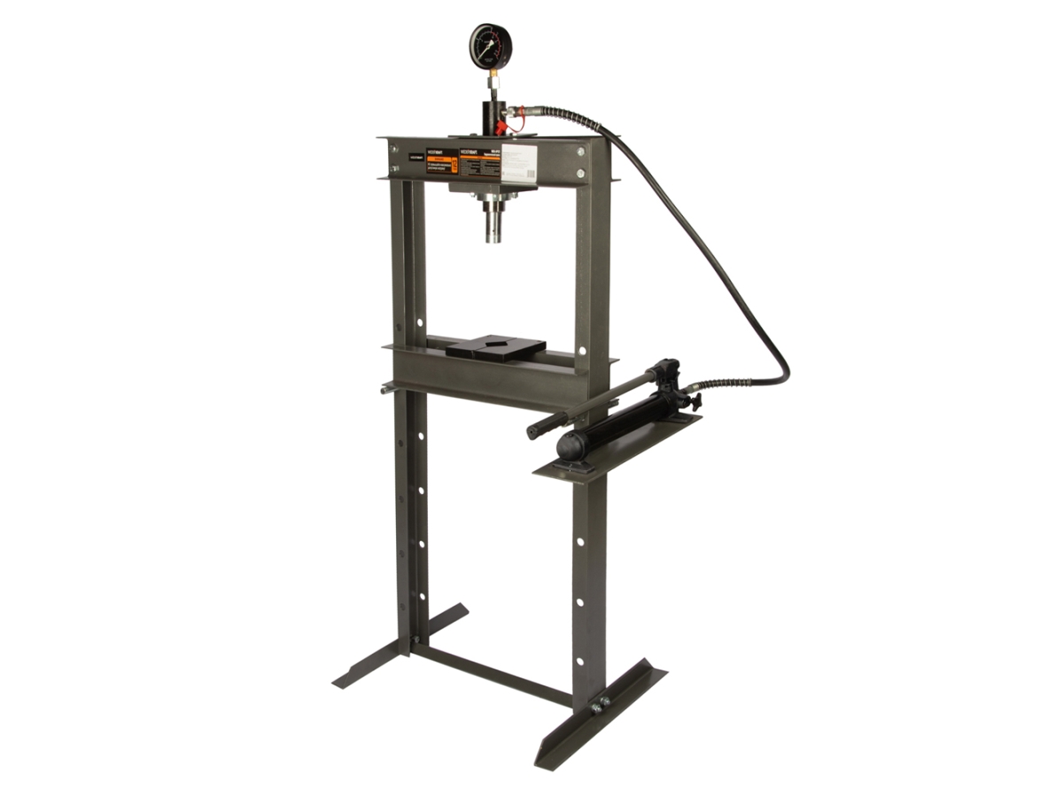 Поставляется с ручным приводом и не требует подключения к электросети. Для контроля над давлением предусмотрен манометр с четкой и легко читаемой шкалой. Он располагается в верхней части станка – на уровне глаз пользователя. Манометр заполнен компенсирующей жидкостью, что обеспечивает устойчивость к колебаниям давления в системе. Пресс имеет небольшую массу и компактные размеры, именно поэтому его можно использовать даже в небольших ремонтных помещениях. Широкое Н-образное основание исключает раскачивание и падение пресса.