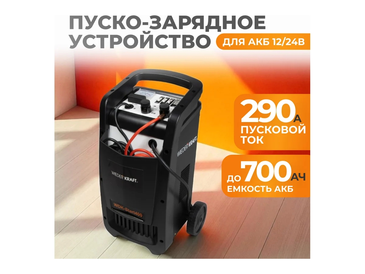 Пуско-зарядное устройство (трансформаторное, для аккумуляторов емкостью до 700Ач) WIEDERKRAFT WDK-Start400 представляет собой простой в обслуживании и управлении аппарат для работы с аккумуляторами транспортных средств вплоть до грузовиков. Контроль заряда осуществляется при помощи встроенного амперметра. ПЗУ изготовлено с исполнением всех требований безопасности: конструкция полностью защищена от перезарядки или неправильного подключения (полярности). Имеется зарядка Boost для ускоренного запуска автомобиля.