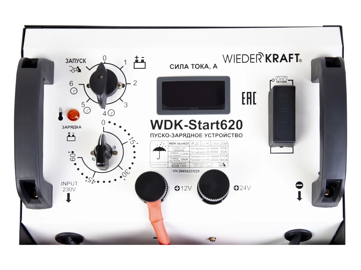 Пуско-зарядное устройство (трансформаторное, для аккумуляторов до 1000Ач) WIEDERKRAFTWDK-Start620 представляет собой простой в обслуживании и управлении аппарат для работы с аккумуляторами транспортных средств вплоть до грузовиков. Контроль заряда осуществляется при помощи встроенного амперметра.