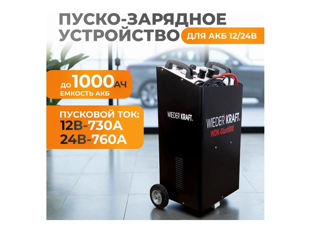 Пуско-зарядное устройство WIEDERKRAFT 12/24 В, 800 А WDK-Start800 используется для быстрого заряда аккумуляторной батареи и запуска различной техники. Мощностей агрегата достаточно для зарядки свинцово-кислотных АКБ, установленных на мотоциклах, моторных лодках и автомобилях с дизельнымии бензиновыми двигателями. Устройство оснащено пультом дистанционного управления для удобства пользования.