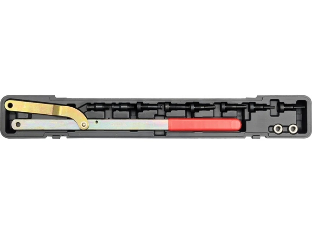 Ключ для фиксации шкивов YATO YT-0627 включает в себя 4 комплекта штифтов (10 мм, 11 мм, 12 мм, 16 мм). Прибор имеет регулируемую ширину захвата. Обрезиненная рукоятка облегчает эксплуатацию изделия.