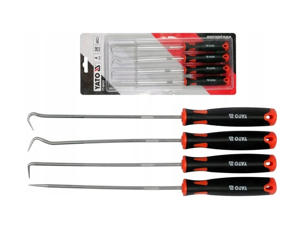 Набор длинных крючков YATO 4 предмета YT-08429 - набор крючков с ручкой. Крючки имеют закаленные и хромированные наконечники из стали 40 CR. Ручки изготовлены из двухкомпонентного материала, что облегчает надежный хват.