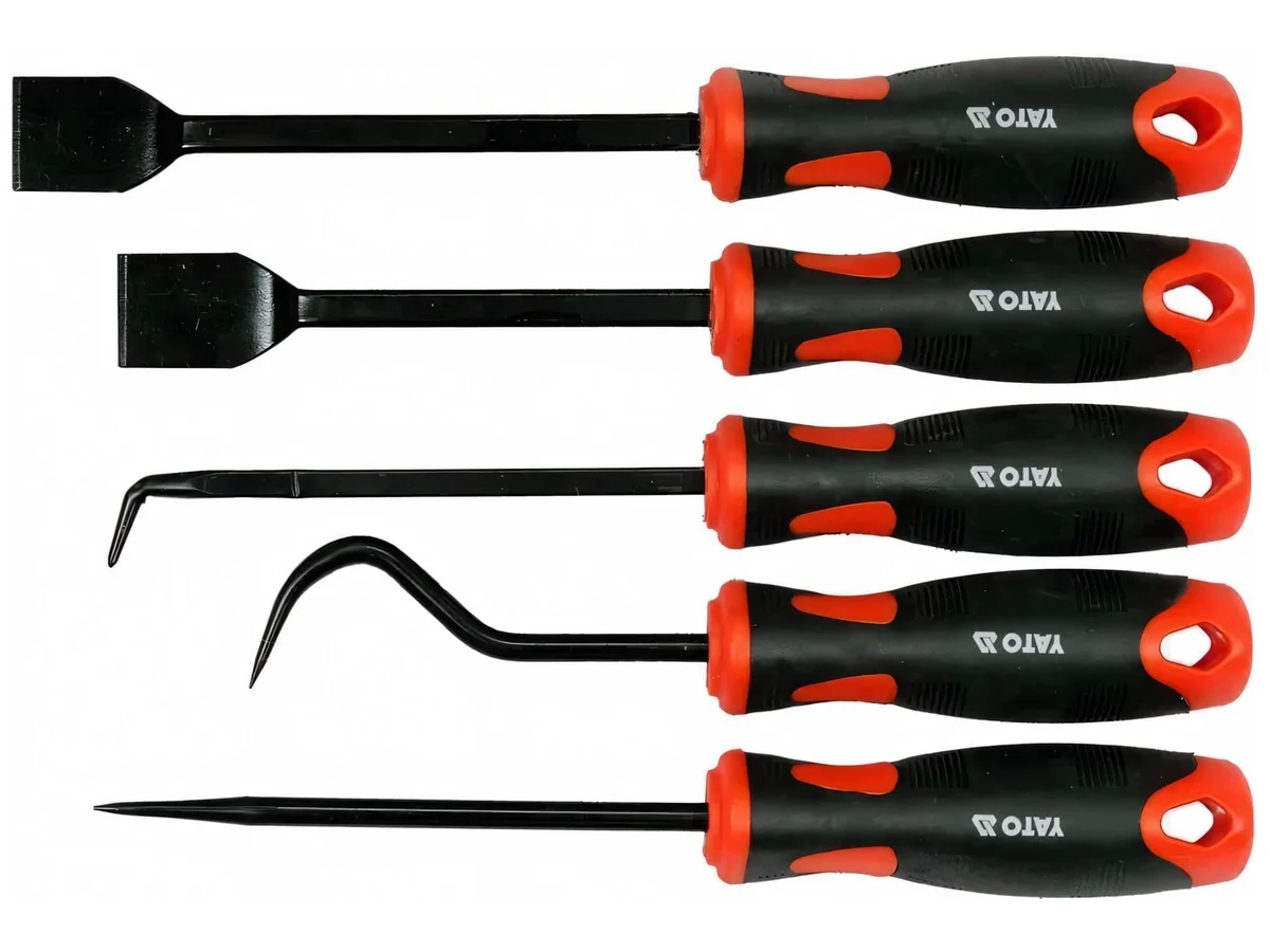 Набор крючков и скребков YATO 5 предметов YT-08422 включает в себя крючки, которые имеют закаленные и хромированные наконечники из стали 40 CR. Ручки изготовлены из двухкомпонентного материала, что облегчает надежный хват.