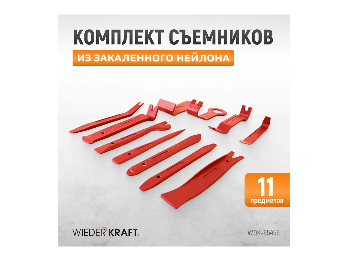 Съемники панелей салона автомобиля WIEDERKRAFT набор 11 предметов WDK-65455 - удобные и качественные приспособления, которые облегчают демонтаж элементов салона автомобиля и позволяют проводить эти работы без повреждений. В комплекте 11 съемников.