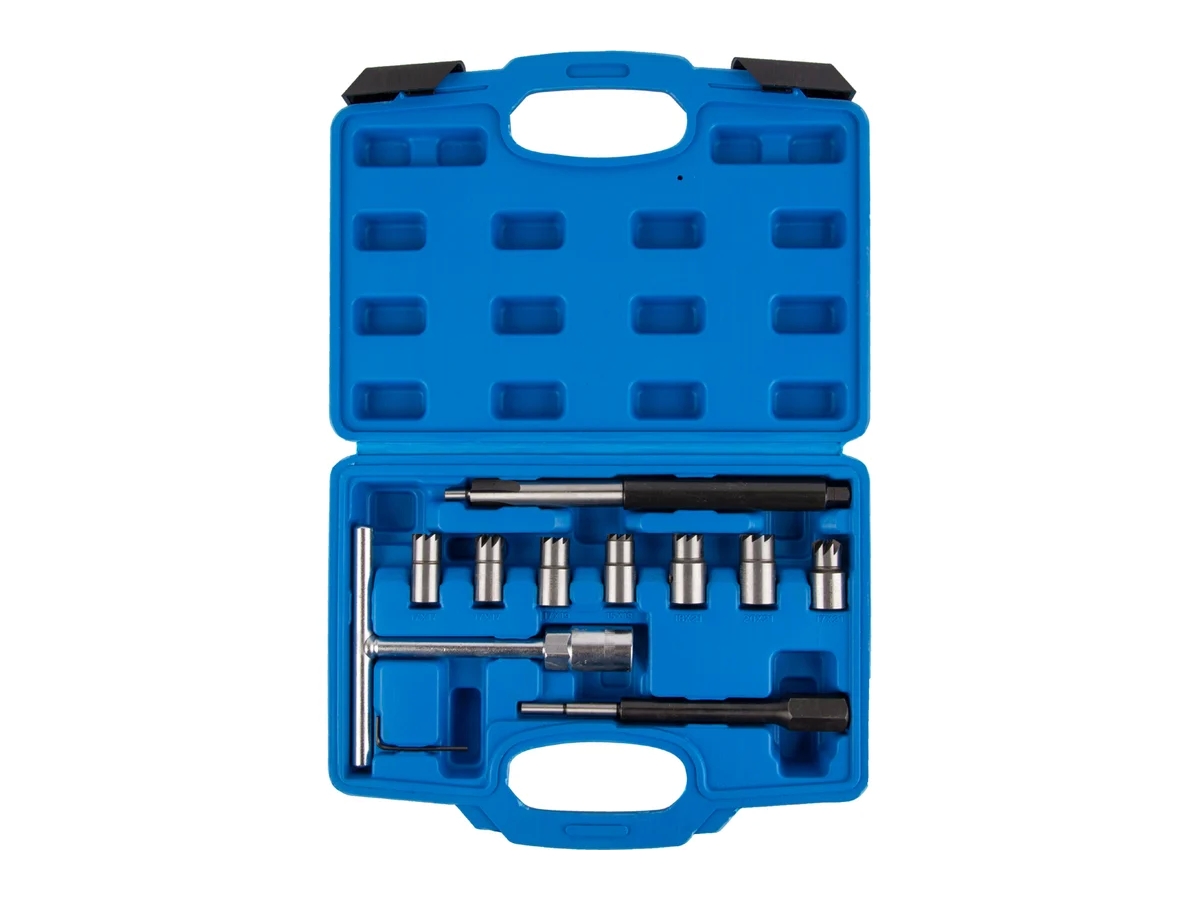 Набор для правки и восстановления посадочных мест форсунок WIEDERKRAFT WDK-214980C1 предназначен для притирки седел форсунок дизельного двигателя для плотного прилегания новых форсунок. Инструмент позволяет очистить седла форсунок от нагара, сгладить микронеровности и обеспечить герметичную посадку форсунки. 7 фрез: 17x17, 17x19, 17x21, 15x19, 18x21, 20x21 мм.