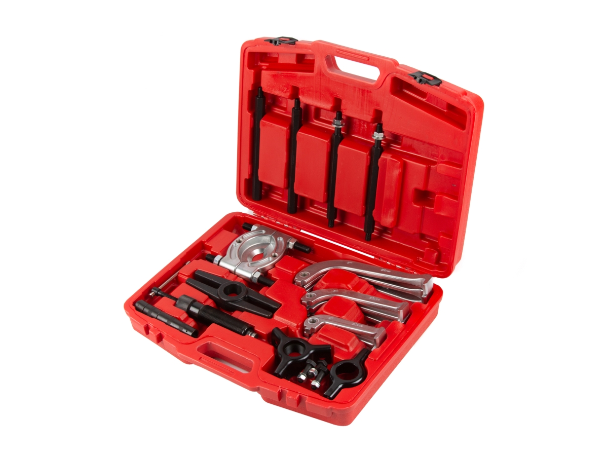 Гидравлический съемник WIEDERKRAFT набор 25 предметов WDK-214850 с сепаратором и захватами для быстрого демонтажа подшипников, шкивов, втулок и других деталей, имеющих посадку с натягом. Максимальное усилие — 10 тонн. Используется на промышленных предприятиях, а также в автомобильных мастерских и на СТО для обслуживания, коммерческого и грузового транспорта.