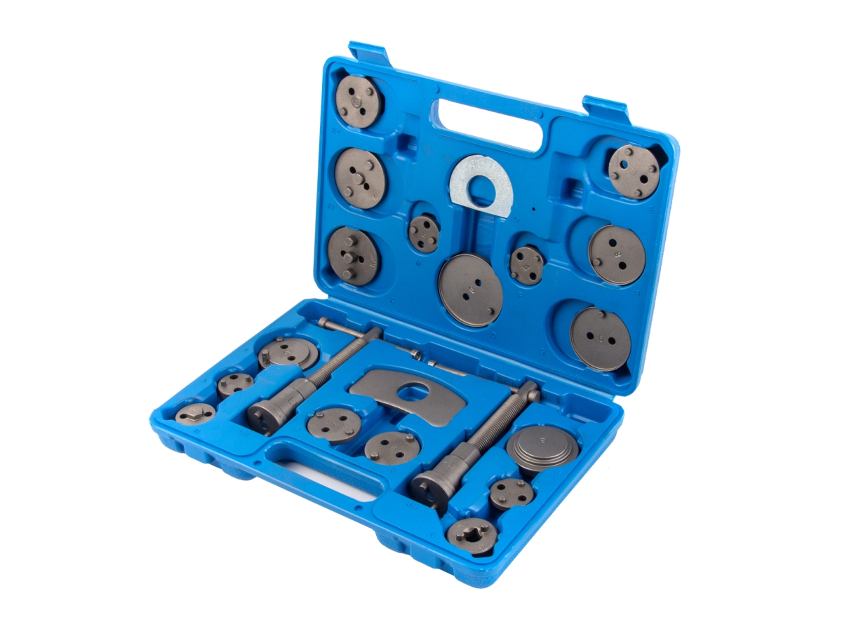 Инструмент для обслуживания тормозных суппортов WIEDERKRAFT набор 18 предметов WDK-214370 применяется в случаях неисправностей, небольших неполадок, а также в ходе сервисного или гарантийного обслуживания компонентов тормозной системы как грузовых, так и легковых автомобилей различных марок. С помощью специальных насадок и ручных приводных инструментов с правой и левой резьбой оператор сможет снять головной цилиндр для его дальнейшего обслуживания.