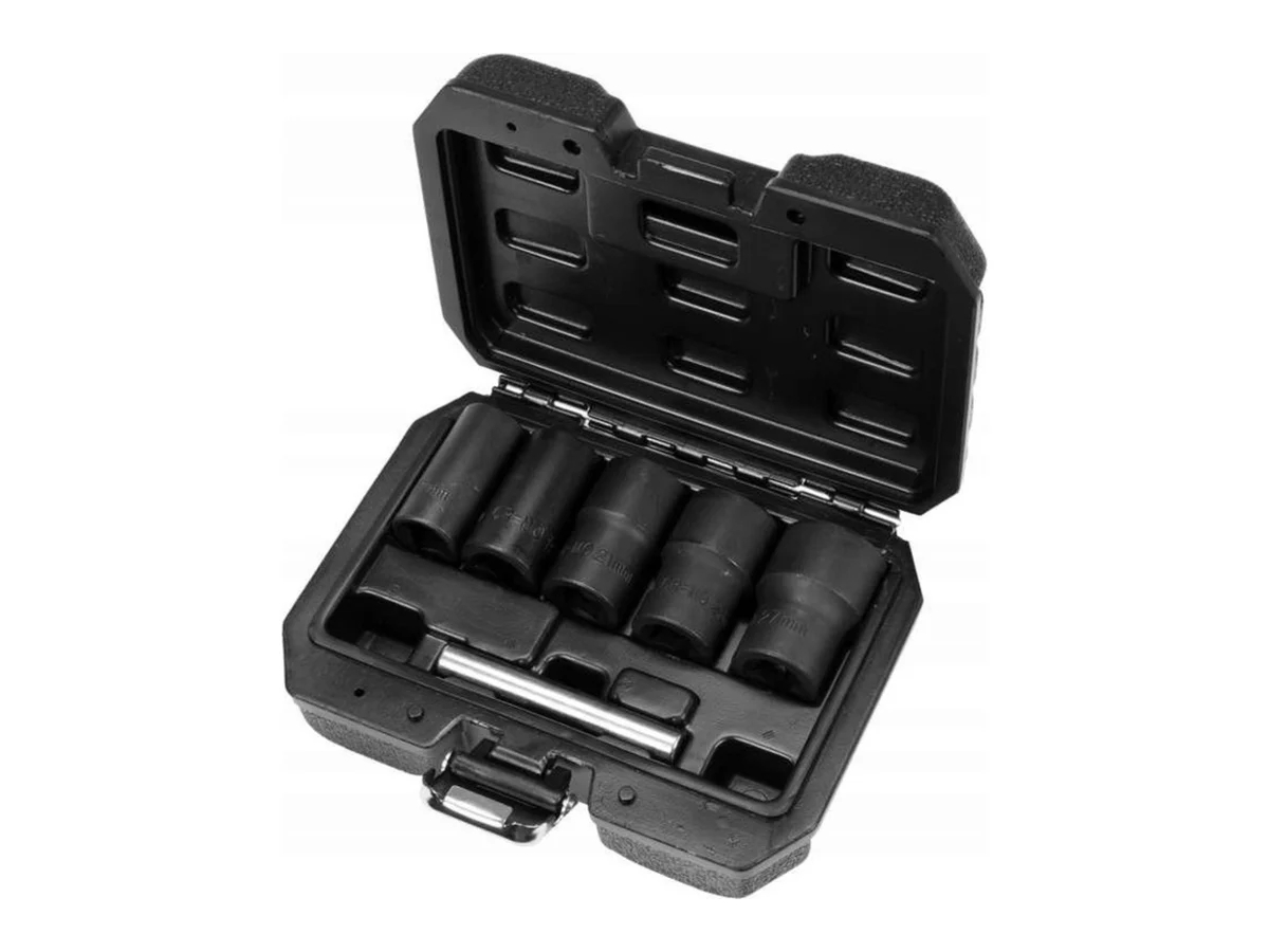 - В комплекте 5 торцевых головок для болтов и гаек размером 17-27 мм и молоток