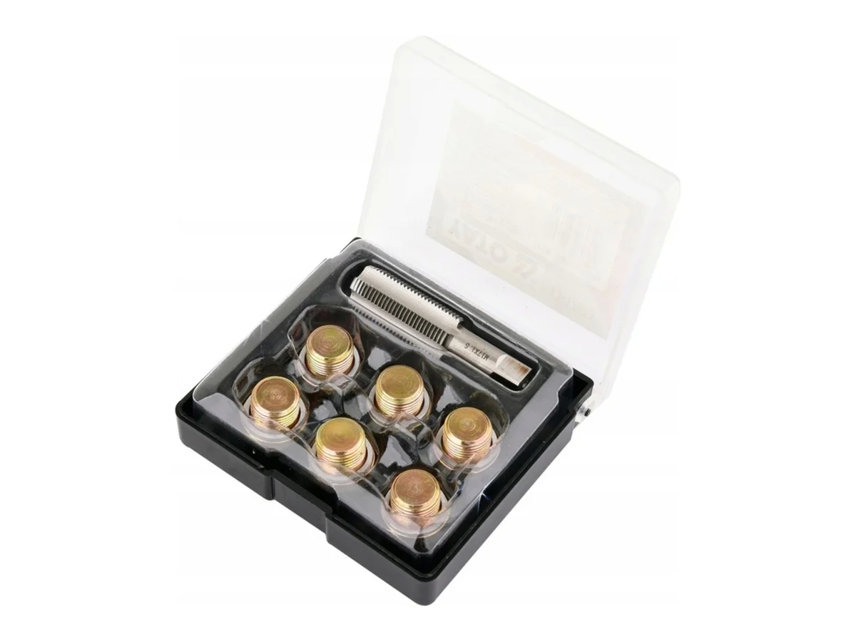 Набор для ремонта масляных пробок YATO М17x1,5мм YT-17573 - набор для простого ремонта резьбы масляного поддона, сливных пробок коробки передач и т. д. Подходит для большинства распространенных резьбовых соединений легковых автомобилей и легких грузовиков.