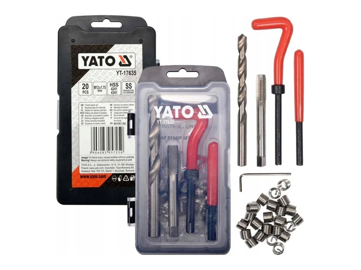 Набор для ремонта резьбы YATO М12x1,75мм YT-17635 предназначен для замены сломанной нити на новую. Элементы из прочной нержавеющей стали упакованы в удобный кейс.