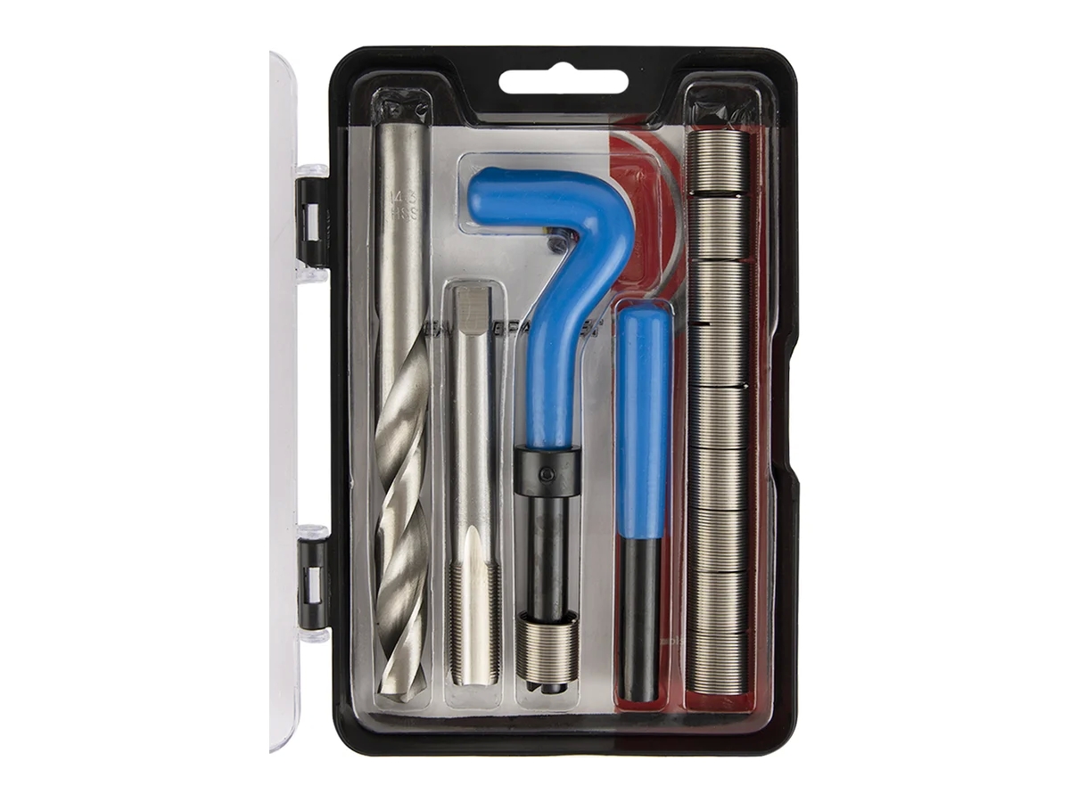 Данный набор, состоящий из специальных инструментов, разработан для восстановления повреждённых резьбовых соединений. Комплектация включает сверло, вороток, боек, метчик STI и резьбовые вставки различных размеров, изготовленные из нержавеющей стали.