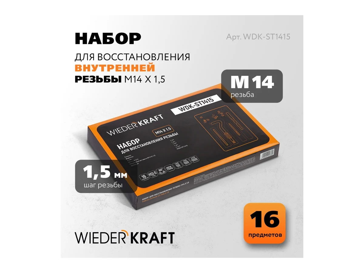 Набор для восстановления резьбы WIEDERKRAFT M14x1,5, 16 предметов WDK-ST1415 поможет с легкостью восстановить резьбовое соединение, сохранив при этом исходный диаметр и шаг. С использованием вставки резьба улучшает свои показатели от изначальных (особенно в мягких металлах).Получается сверхпрочное соединение и значительно продлевается его ресурс.
