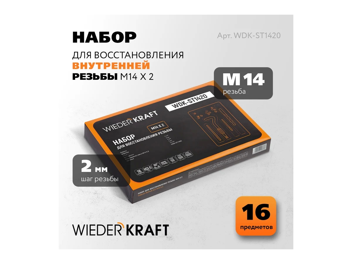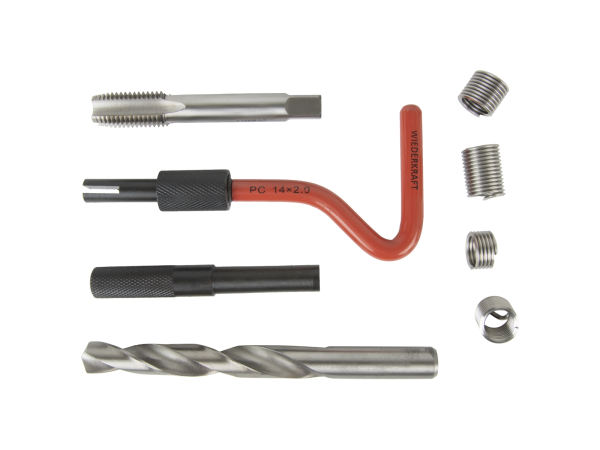 Набор для восстановления резьбы WIEDERKRAFT M14x2, 16 предметов WDK-ST1420 поможет с легкостью восстановить резьбовое соединение, сохранив при этом исходный диаметр и шаг. С использованием вставки резьба улучшает свои показатели от изначальных (особенно в мягких металлах).Получается сверхпрочное соединение и значительно продлевается его ресурс.