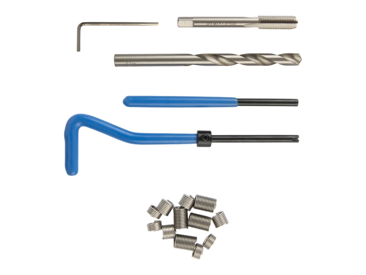 Данный набор, состоящий из специальных инструментов, разработан для восстановления повреждённых резьбовых соединений. Комплектация включает сверло, вороток, боек, метчик STI и резьбовые вставки различных размеров, изготовленные из нержавеющей стали.