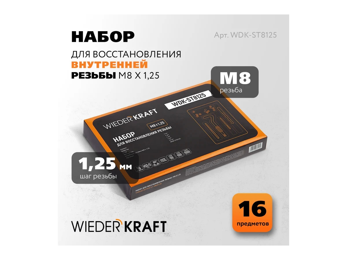 С помощью набораWIEDERKRAFT M8x1.25, 16 предметов WDK-ST8125 можно с легкостью восстановить резьбовое соединение, сохранив при этом исходный диаметр и шаг.
