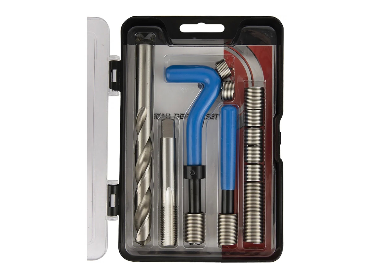 Данный набор, состоящий из специальных инструментов, разработан для восстановления повреждённых резьбовых соединений. Комплектация включает сверло, вороток, боек, метчик STI и резьбовые вставки различных размеров, изготовленные из нержавеющей стали.