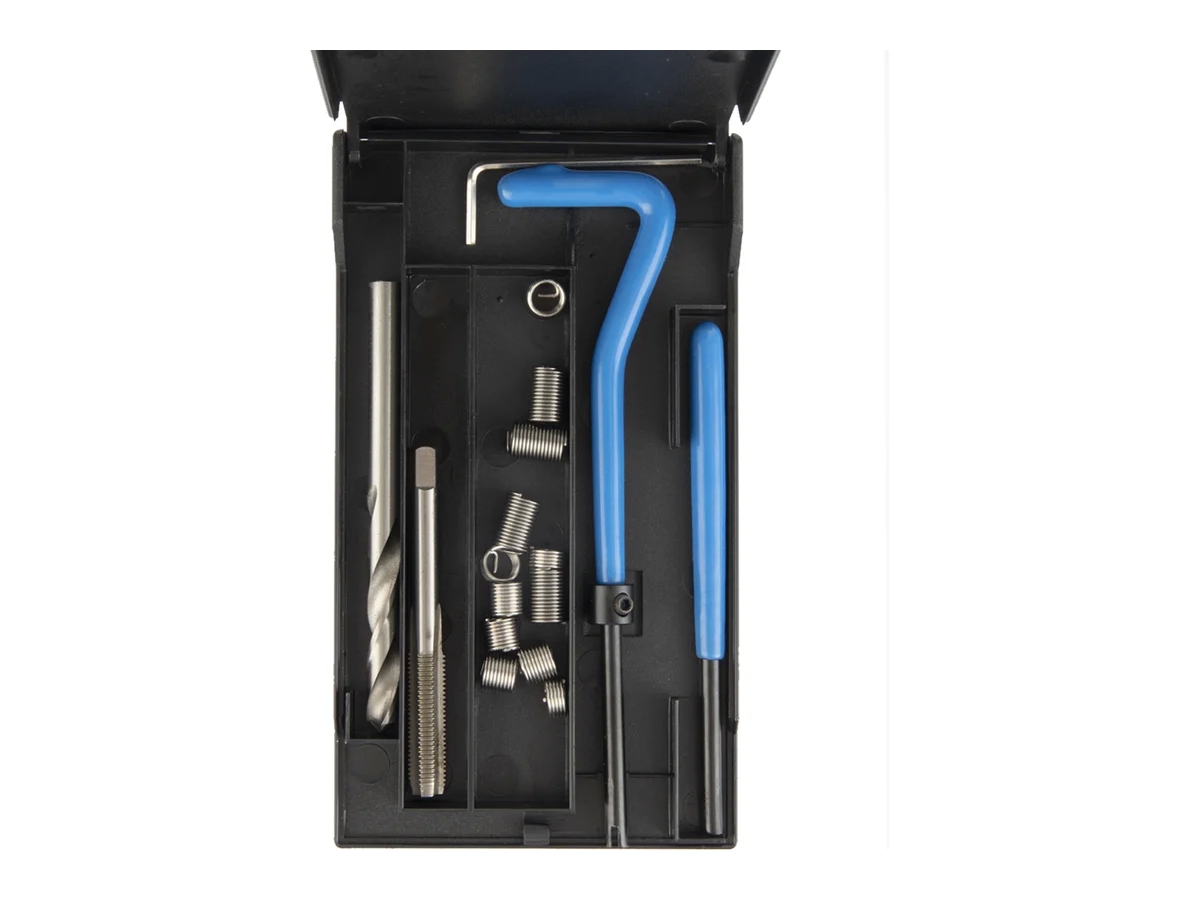Данный набор, состоящий из специальных инструментов, разработан для восстановления повреждённых резьбовых соединений. Комплектация включает сверло, вороток, боек, метчик STI и резьбовые вставки различных размеров, изготовленные из нержавеющей стали.