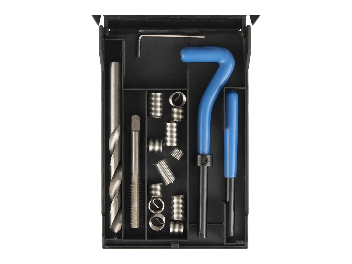 Данный набор, состоящий из специальных инструментов, разработан для восстановления повреждённых резьбовых соединений. Комплектация включает сверло, вороток, боек, метчик STI и резьбовые вставки различных размеров, изготовленные из нержавеющей стали.