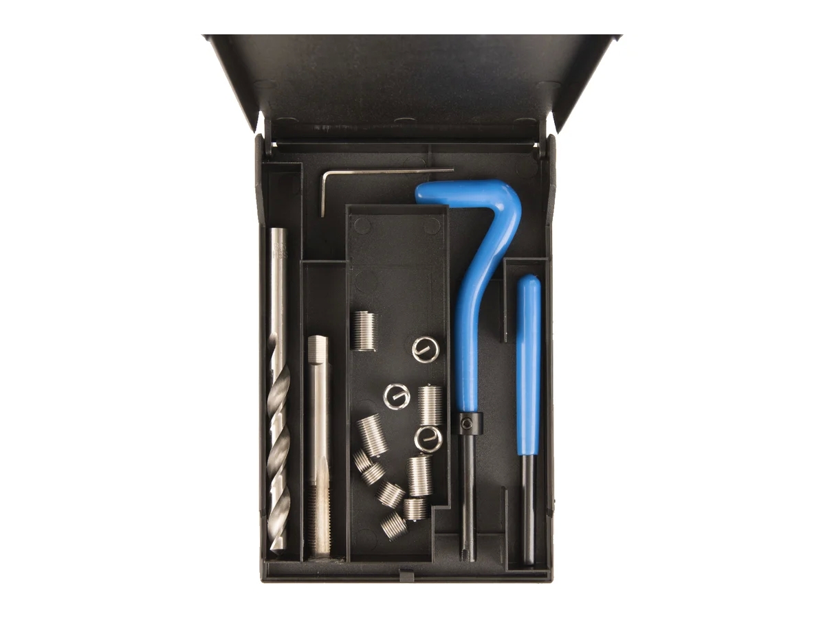 Данный набор, состоящий из специальных инструментов, разработан для восстановления повреждённых резьбовых соединений. Комплектация включает сверло, вороток, боек, метчик STI и резьбовые вставки различных размеров, изготовленные из нержавеющей стали.