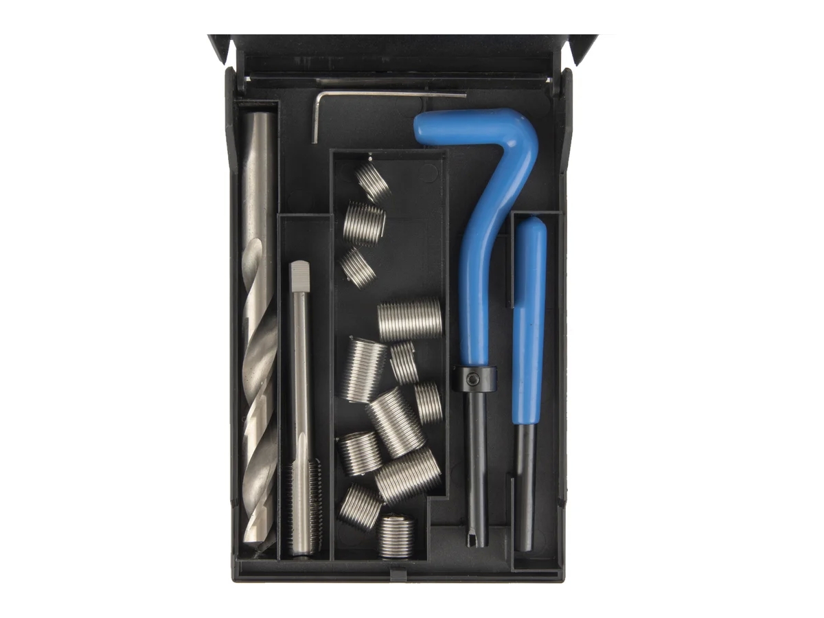 Данный набор, состоящий из специальных инструментов, разработан для восстановления повреждённых резьбовых соединений. Комплектация включает сверло, вороток, боек, метчик STI и резьбовые вставки различных размеров, изготовленные из нержавеющей стали.