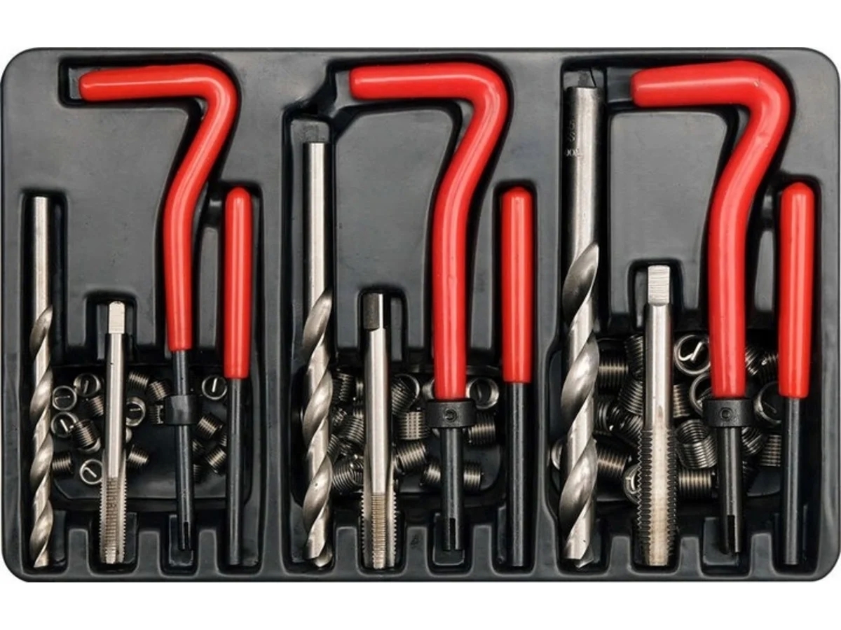 Профессиональный набор для ремонта резьбы М6 – М110. Сверла и метчики изготовлены из быстрорежущей стали HSS 4341. Метчики одноступенчатые нарезают резьбу, в которую вставляется спиральная вставка из твердой нержавеющей стали. Для вставки вставки используется направляющая ручка и боек, которым обламывается выступающий кончик вставки.