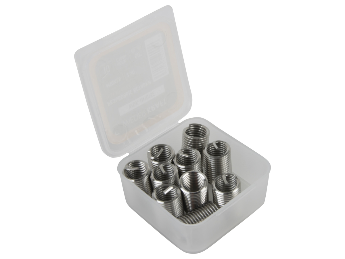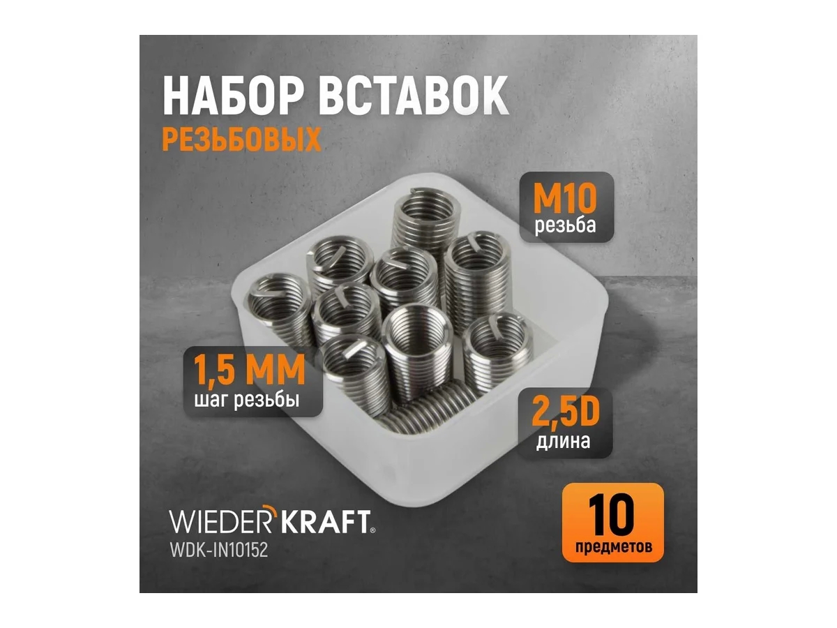 Резьбовые вставки WIEDERKRAFT M10x1,5, 2,5d, 10 предметов WDK-IN10152 предназначены для восстановления резьбы M10X1,5. Длина 2,5D. Изготовлены из нержавеющей стали.