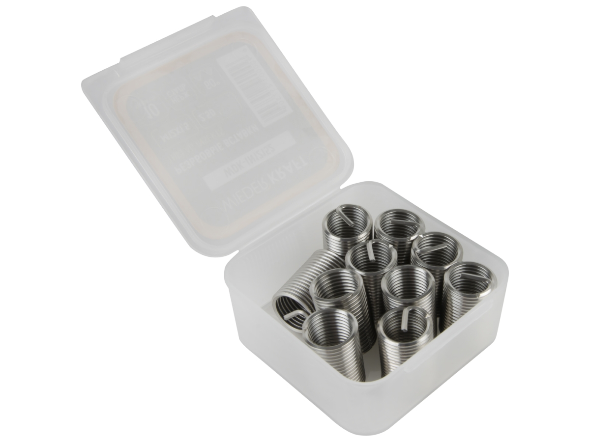 Резьбовые вставки WIEDERKRAFT M12x1,5, 2,5d, 10 предметов WDK-IN12152 предназначены для восстановления резьбы M12x1,5. Длина 2,5D. Изготовлены из нержавеющей стали.