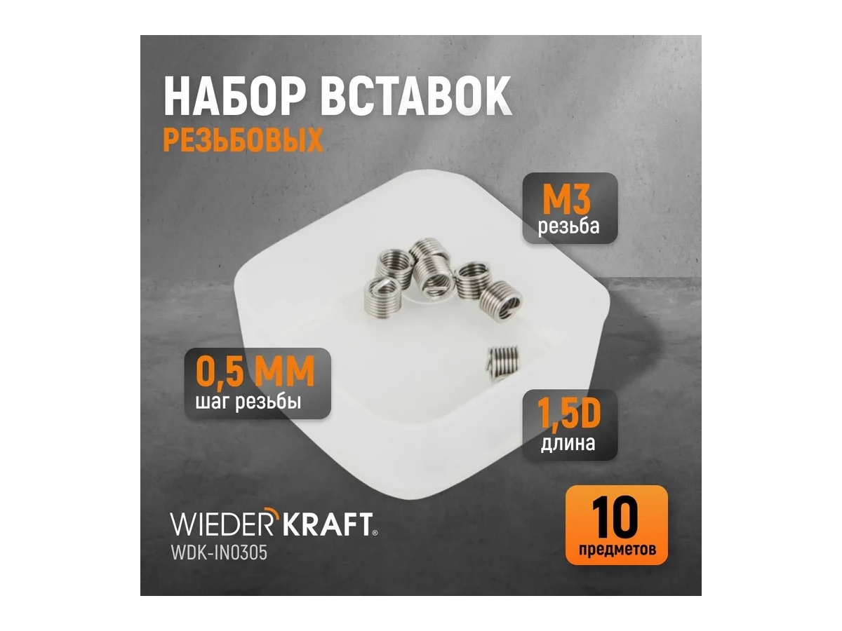 Резьбовые вставки WIEDERKRAFT M3x0,5, 1,5d, 10 предметов WDK-IN0305 предназначены для восстановления резьбы M3X0,5. Длина 1,5D. Изготовлены из нержавеющей стали.