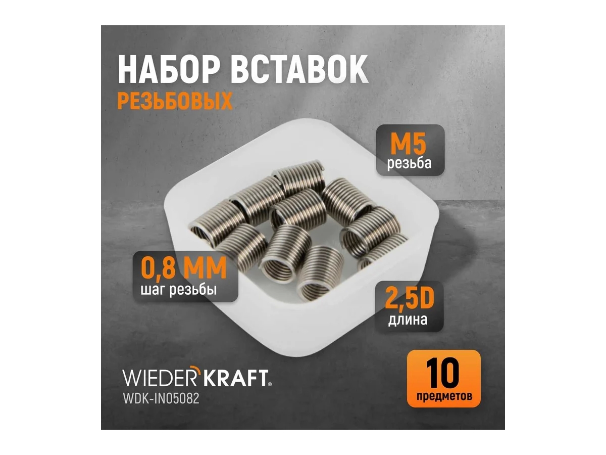 Резьбовые вставки WIEDERKRAFT M5x0,8, 2,5d, 10 предметов WDK-IN05082 предназначены для восстановления резьбы M5X0,8. Длина 2,5D. Изготовлены из нержавеющей стали.