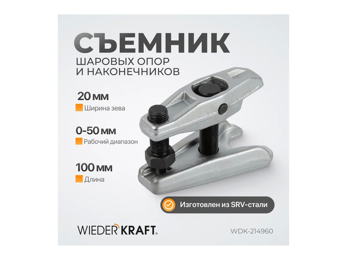 Съемник шаровых опор WIEDERKRAFT WDK-214960 представляет собой специализированный демонтажный инструмент для рулевых тяг и шаровых опор. Он имеет компактный размер, что позволяет использовать его в труднодоступных местах с ограниченным пространством, ширина зева регулируется в диапазоне от 18 до 22 мм, обеспечивая универсальное применение.