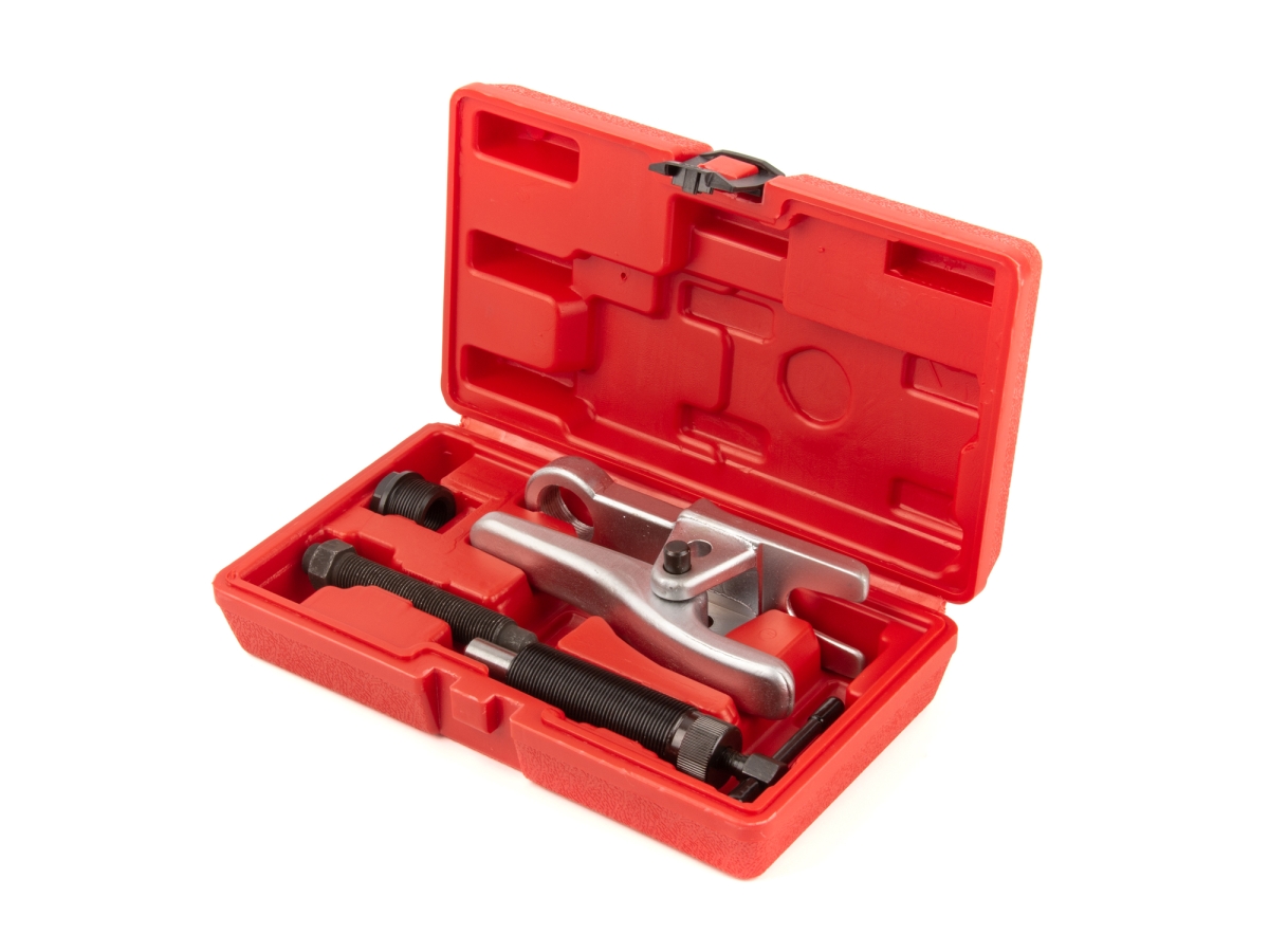 Инструмент представляет собой вилочный (рычажный) съемник, оснащенный встроенным гидравлическим цилиндром. Давление, создаваемое гидравликой, плавно выдавливает палец шаровой опоры из посадочного места, что предотвращает повреждение смежных узлов (таких как алюминиевые рычаги) и пыльников.