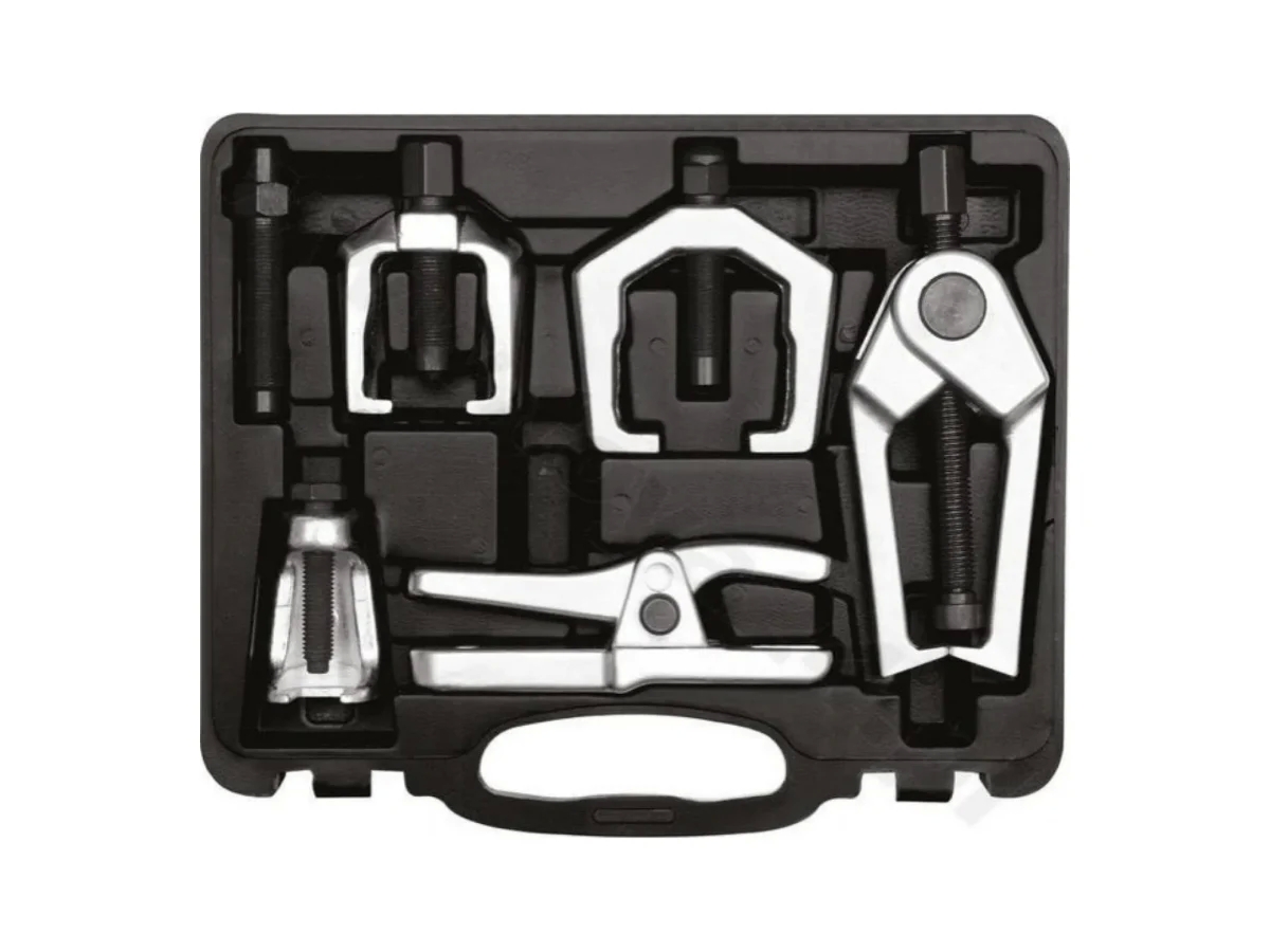 Набор съемников шаровых опор и рулевых наконечников YATO YT-06157 включает в себя 6 предметов, предназначенных для быстрого и комфортного снятия рулевого рычага, шаровых опор или рулевой тяги. Все инструменты из набора выполнены из высококачественной стали, прошедшей термообработку и обладающей большой прочностью и износостойкостью.