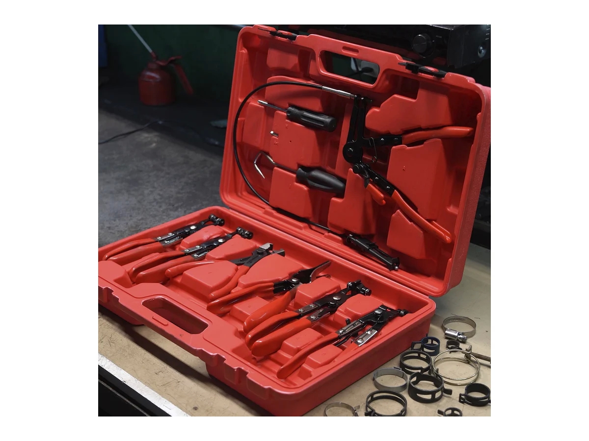 Набор съемников для работы с хомутами WIEDERKRAFT 9 предметов WDK-214690 оптимальны для проведения работ с хомутами на масляных, водяных и топливных шлангах транспортных средств. Для фиксации хомута в разжатом виде в конструкции предусмотрен трещоточный механизм.