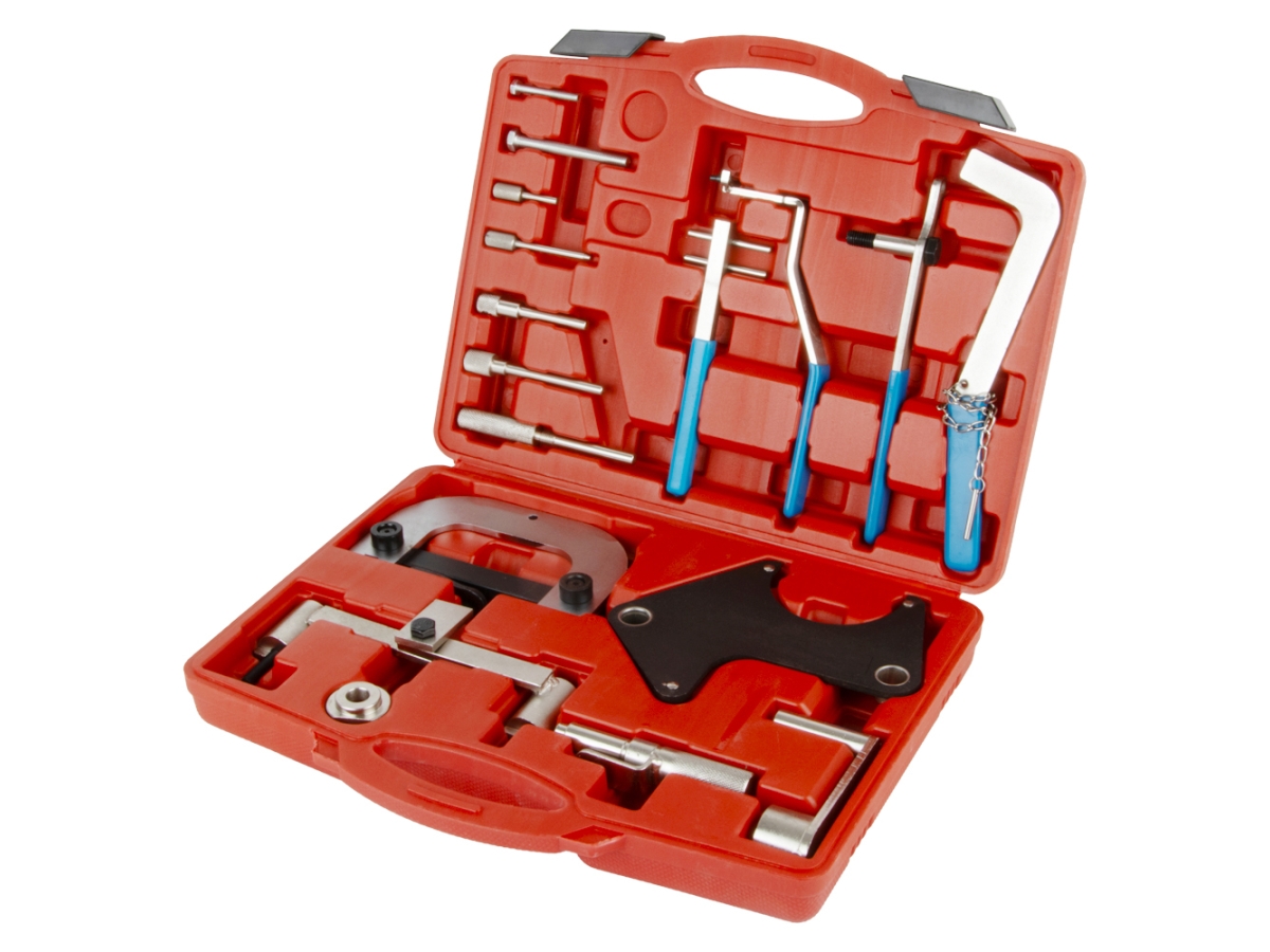 Комплект для обслуживания бензиновых и дизельных двигателей автопроизводителя Renault. С его помощью можно производить фиксацию маховика и коленчатого вала, фиксацию вала ТНВД, снятие шкива и т.д. Пластиковый кейс обеспечивает удобство хранения и транспортировки набора, в его конструкции предусмотрены специальные защелки, исключающие выпадение приспособлений.