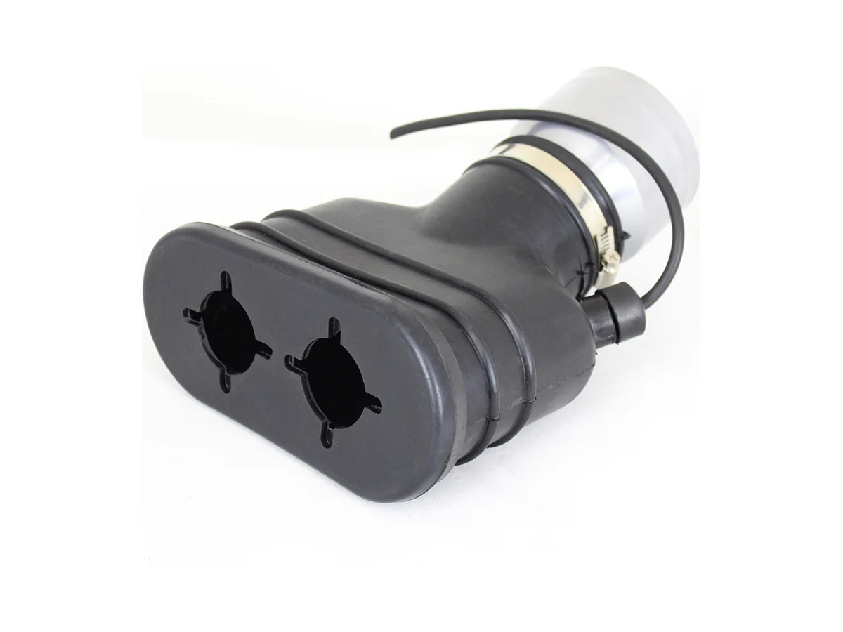 Насадка для вытяжки выхлопных газов WIEDERKRAFT WDK-86612 предназначена для подключения шланга диаметром 75–76 мм к сдвоенной выхлопной трубе автомобиля. Овальная форма и прорези на корпусе обеспечивают надежную фиксацию.