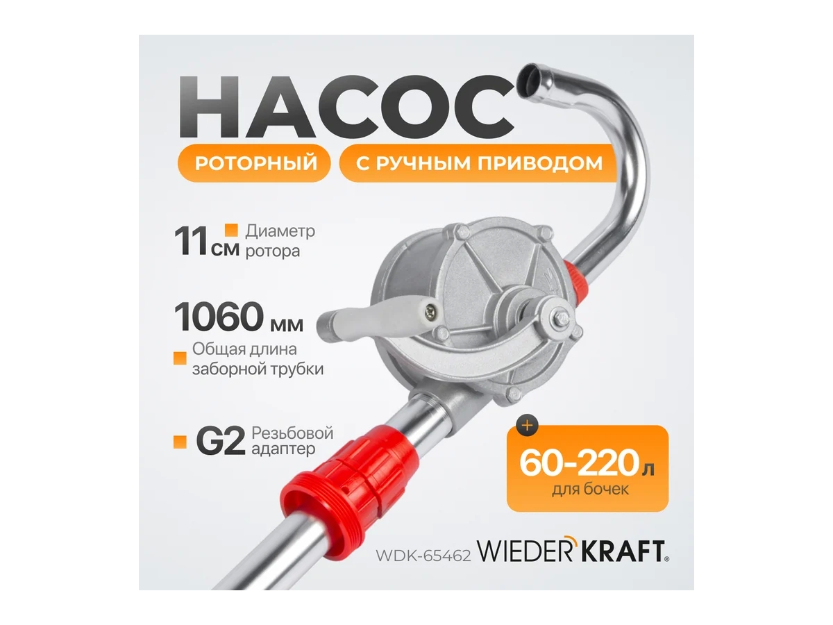 Ручной роторный насос WIEDERKRAFT WDK-65462 предназначен для перекачки горюче-смазочных материалов из бочек обемом от 60 до 220 литров. Надежная конструкция с двухлопастным ротором обеспечивает стабильную подачу жидкости и длительный срок службы. Насос идеально подходит для работы с маслами, дизельным топливом, керосином и другими техническими жидкостями низкой и средней вязкости.