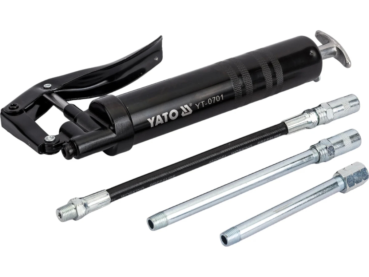 Шприц YATO для консистентной смазки 120 мл с жестким и гибким шлангом под запасную тубу YT-0701 широко используется в автосервисах для технического обслуживания автомобиля. Шприц необходим для замены масла в коробке передач, трансмиссии, деталях, куда нужно добавить небольшое количество масла. Приспособление удобно для подачи смазки в труднодоступные места узлов и агрегатов с помощью входящих в комплект стальной трубки или гибкого шланга. Шприц имеет высокую производительность и продолжительный срок службы. Вмещает 120 мл смазочного материала.